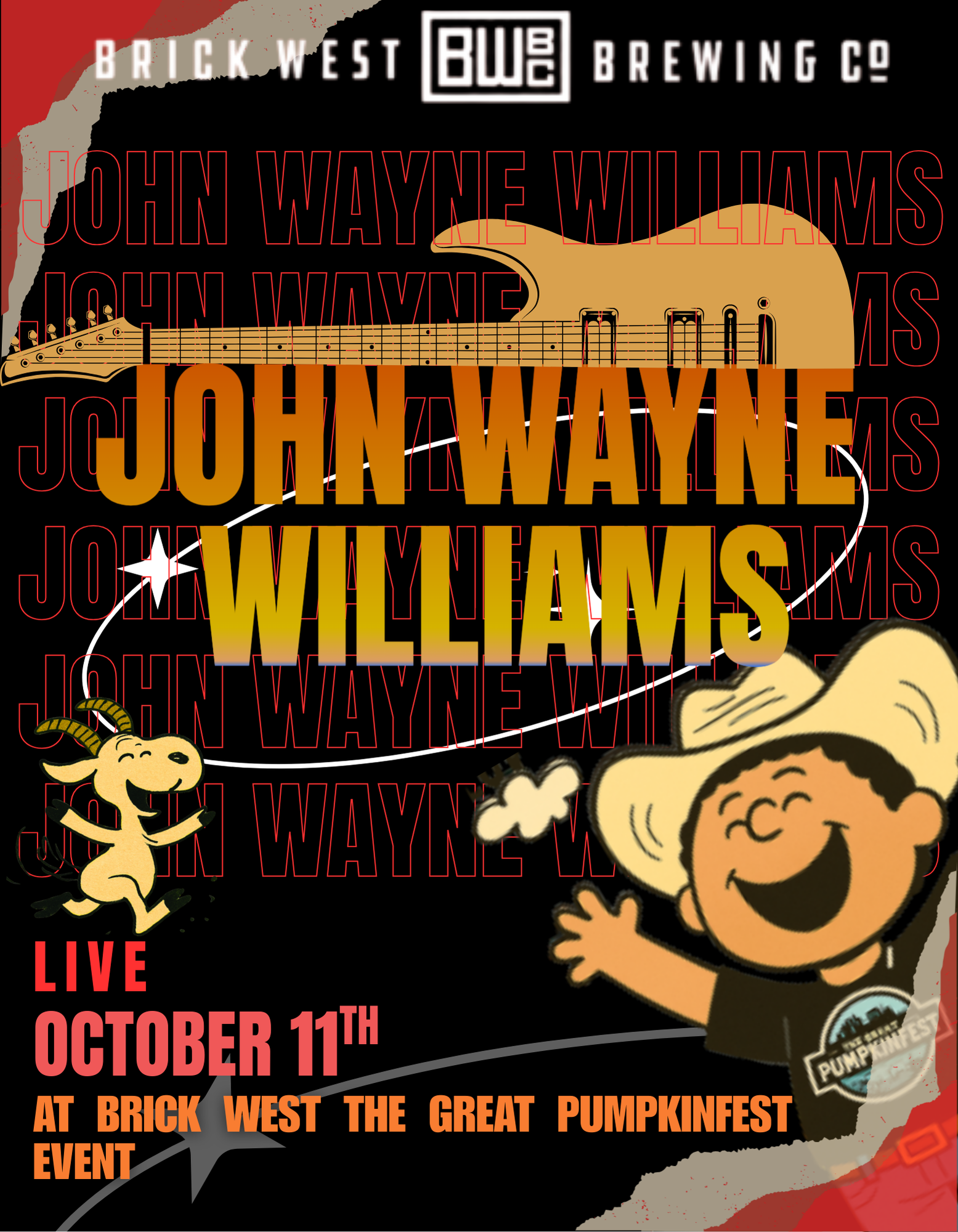 Host Organization: Brick West Brewing Co. Description: 🎶 Live music at Pumpkinfest! 🎃 John Wayne Williams is taking the Brick West stage on Saturday, Oct. 11th for a night of great tunes, good vibes, and all the fall fun. 🍂...
