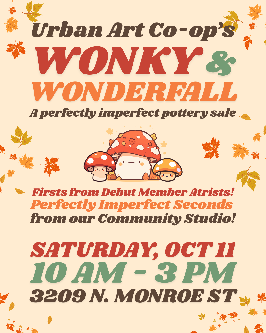 Host Organization: Urban Art Co-op Description: Get an early start on holiday shopping! Visit the Wonky & Wonderfall Pottery Sale sponsored by the Urban Art Co-op on North Monroe. We'll have new ceramic artists, a variety of vendors, pottery demos,...