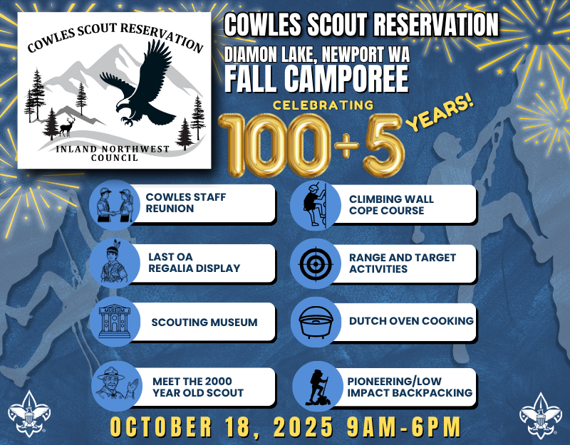 Host Organization: Inland Northwest Council Scouting America Description: Join Us for the Cowles Scout Reservation Camporee: Honoring 105 Years of Scouting Legacy!** Calling all past Camp Cowles staff, Scout leaders, and registered Scouts BSA Scouts! Be a part of this...