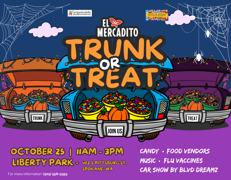 Host Organization: Latinos en Spokane Description: Get ready for a day full of fun at El Mercadito Spokane’s Trunk or Treat event! Join us for a community celebration filled with festive Halloween activities. This family-friendly event will feature: • Car...
