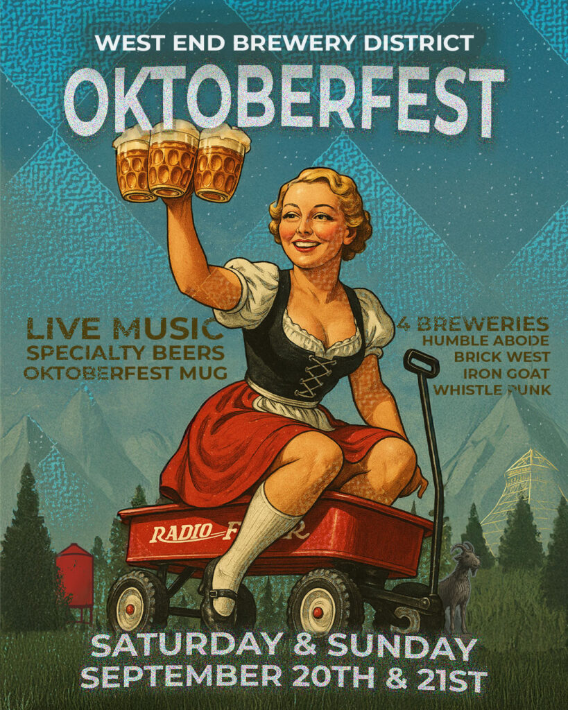 A two-day walk-around beer festival featuring Oktoberfest-themed brews from Iron Goat Brewing, Humble Abode Brewing, Whistle Punk Brewing, and Brick West Brewing. Guests receive a collectible 2025 Oktoberfest mug, redeemable for $4 specialty pours at all locations. Live music, food vendors, and Bavarian-themed fun all weekend. Many venues remain family-friendly.