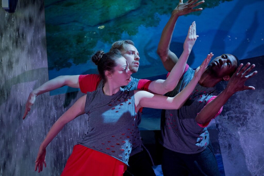 Sea Change Within Us, by Karin Stevens Dance, is a sixty-minute performance addressing local Washington state water concerns and climate change consequences through the voices of real people we interviewed, combined with moving rigid structures of water images by dancing human bodies. Ten dancers move four panels into dynamic configurations to express concerns about rivers and dams, endangered species, ice, ocean and sea-level rise, flooding, migration, Indigenous fishing rights injustice, divisive politics, and human dis/re/connection. Within these turbulent thematic layers, grief is addressed through the real sounds of Tahlequah’s cries in the “Rivers, Dams, Salmon, Orca” section. Collective awareness is awakened in the section “Descending Pressure” with the repeated phrase from a climate activist-artist, “Our bodies are a source of wisdom.” The performance encourages unification with our ecosystems and throughout difficult content there is contemplation and beauty to support the felt-urgency of our crises. As a message to disrupt a myopic, singular viewpoint, the audience is invited to view the work from all sides and participate in a simple, guided embodied movement practice to re/connect to a whole-bodied relationship with water and the ensuing performance. The project was conceived, directed and choreographed by Karin Stevens, with original sound compositions by Kaley Lane Eaton and Jessi Harvey, and large-scale installation by Roger Feldman. The recreation of this 2019 project was funded by ArtsWA, National Endowment for the Arts, Seattle Office of Arts & Culture, Earth Creative, and 4Culture.